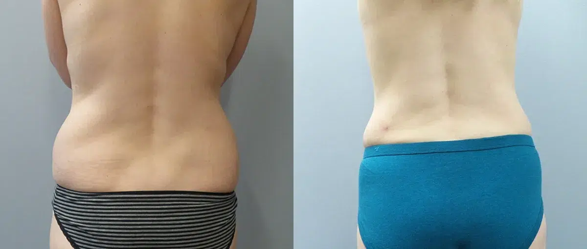 Patient is a 49-year-old female who is 5’6” and 135 lbs and underwent liposuction of the stomach and back. Pictures are 1 month post-op.