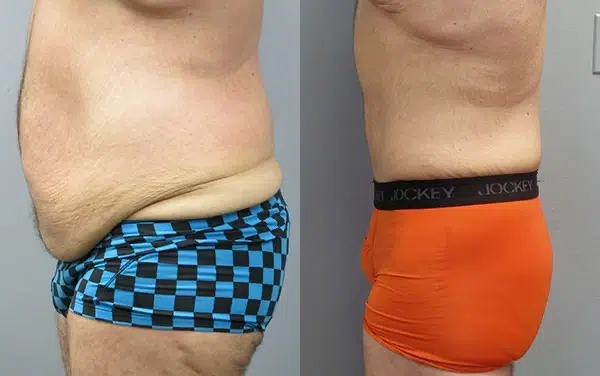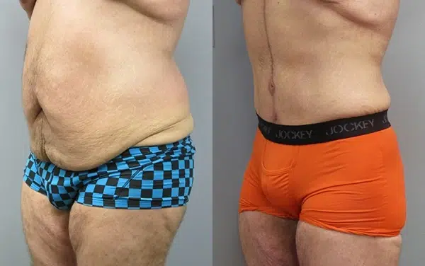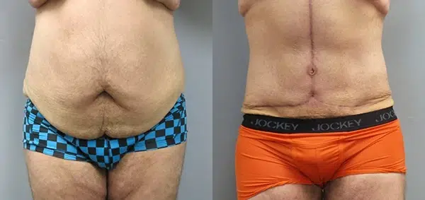 Patient is a 30 year old 195 pound male who had lost 150 pounds. He had excess skin and fat and was more concerned with skin removal than scars. He underwent a “fleur-de-lis” abdominoplasty (inverted-T incision). His is now 6 months post operative.