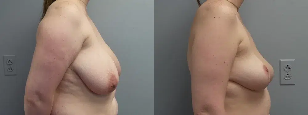 34 y/o female who is 5’6″ 160 pounds. She underwent a reduction and over 400 grams were removed from each breast for a total of over 800 grams. These one year post op.